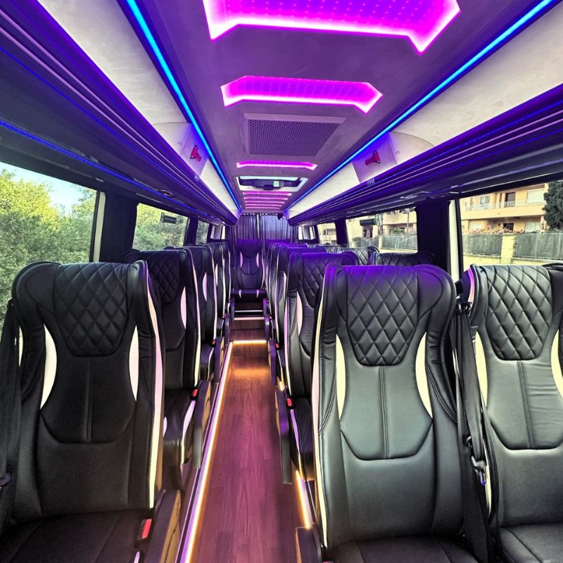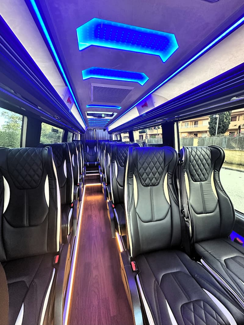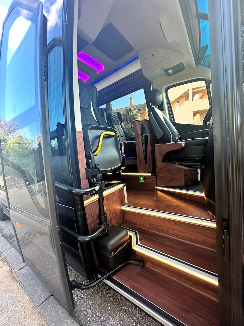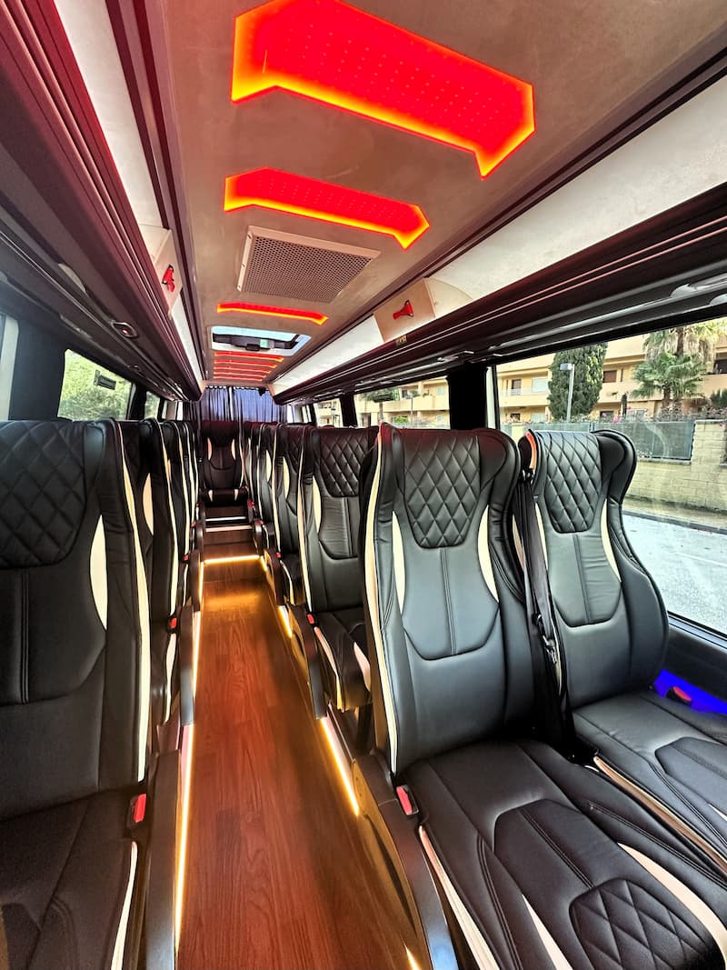 From the first glance, its sleek, aerodynamic exterior and the unmistakable Mercedes-Benz emblem project an image of professionalism and prestige. However, the true experience begins the moment you step inside. Upon boarding, 19 passengers are welcomed into a cabin designed under the strictest principles of ergonomy and premium comfort. The seats, upholstered in high-grade materials with exquisite finishes, offer exceptional support, ensuring that even longer journeys—such as an excursion to Ronda or a transfer to Granada—feel like a brief moment of relaxation.